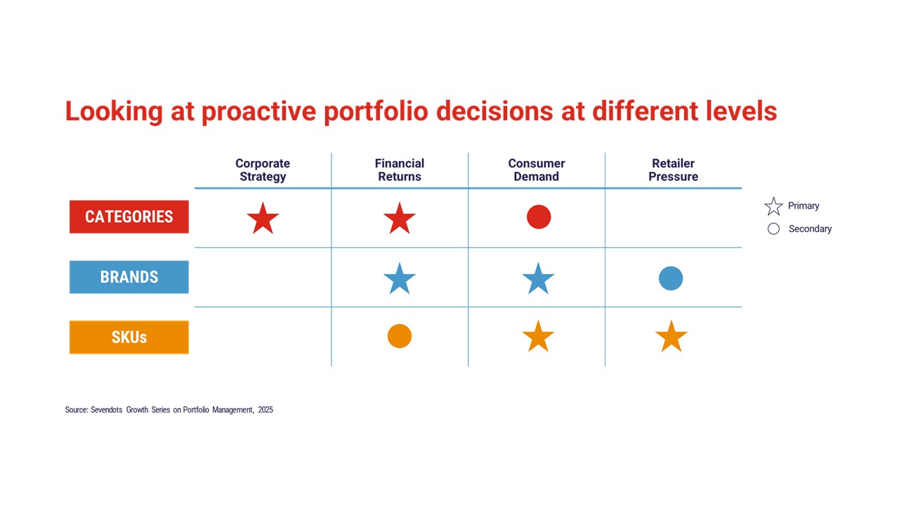 The Sevendots framework links portfolio decisions at category, brand, and SKU level to these integrated triggers, supporting more disciplined and strategic allocation choices.