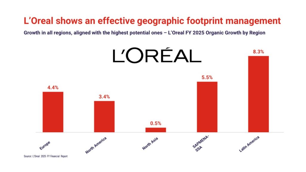 L’Oréal illustrates disciplined geographic alignment. In 2025, the company grew across all regions, with particularly strong performance in Latin America and SAPMENA-SSA, two of the most dynamic global CPG regions. By aligning its footprint with higher-growth markets, L’Oréal benefits directly from regional momentum, reinforcing geography as a foundational driver of penetration and scale.
