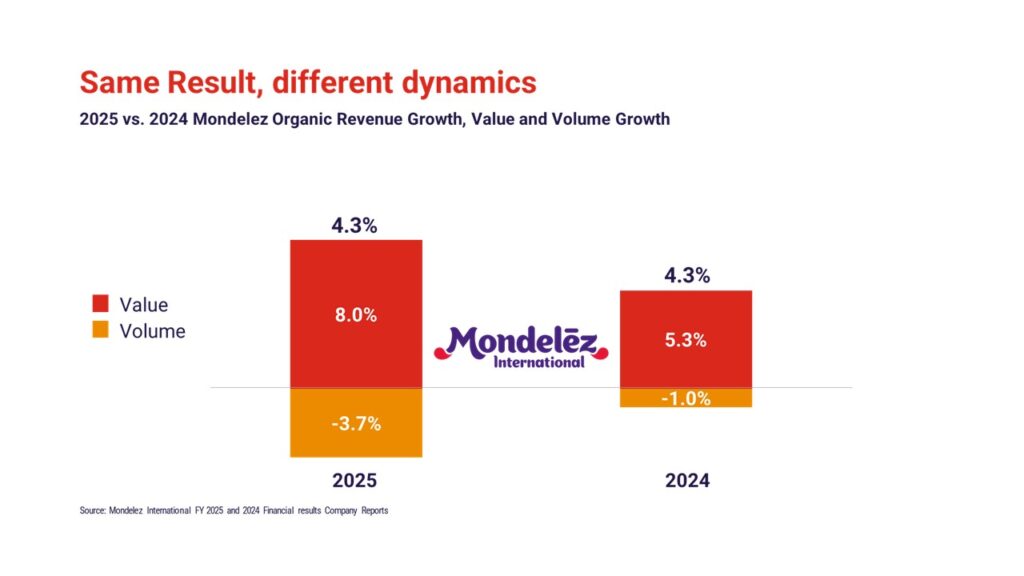 The case of Mondelez illustrates the tension. Organic growth remained stable year-over-year (4.3% in both 2024 and 2025), but the mix shifted dramatically, greater volume loss offset by stronger pricing. At the same time, margins declined significantly Gross margin declined by almost 600 bps and operating margin by 300 bps, partly driven by cocoa inflation.