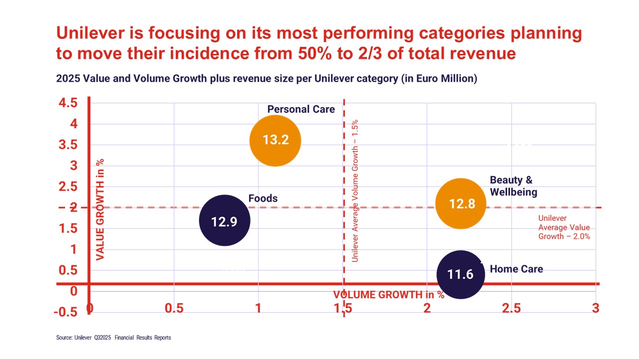 Unilever provides a clear example, sharpening its focus on Beauty & Wellbeing and Personal Care, which today represent 51% of revenue and are planned to grow to two-thirds of the portfolio, divesting structurally declining segments, and explicitly adopting a volume-led execution model.
