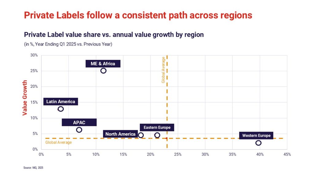 At a global level, Private Labels account for roughly 23% of CPG value, but their penetration varies widely by geography. What is striking, however, is not the disparity itself, but the consistency of the trajectory.