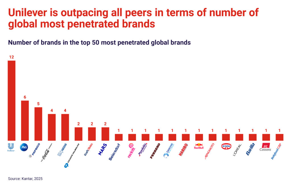 Speaking about penetration, Unilever is the only company having 12 brands in the globally most penetrated ones strongly outpacing all the peers.