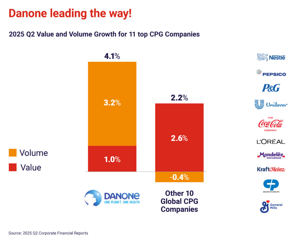 Danone attributes its 3.2% volume growth to disciplined portfolio management and more disciplined execution. They focus on reinforcing and expanding their winning platforms including:
