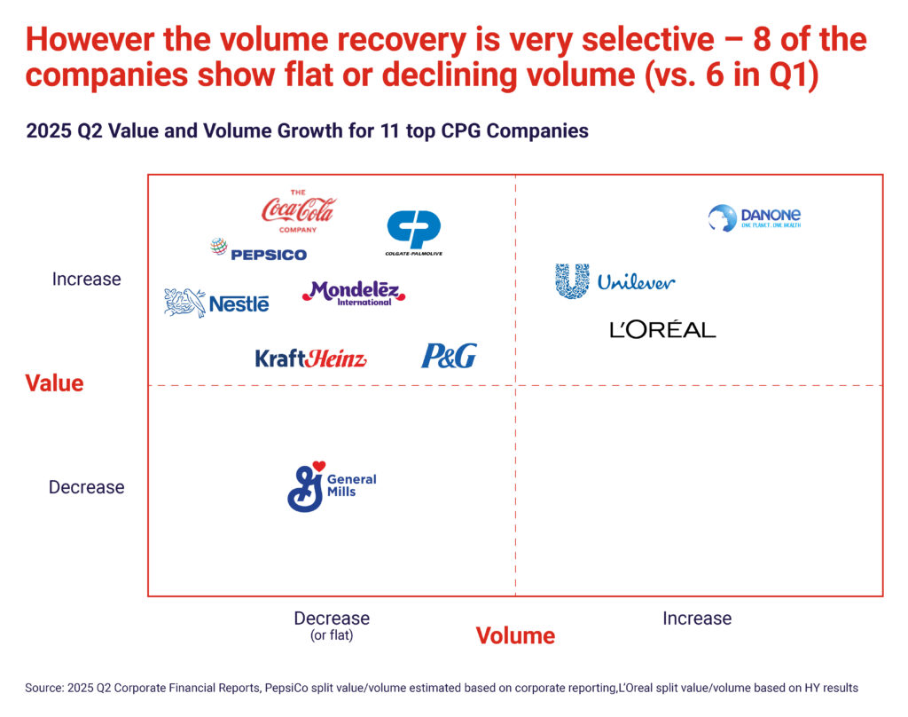 Yet this modest improvement masks a deepening divide: while the average volume improved, the number of companies not growing in volume actually increased, from 6 in Q1 to 8 in Q2. This signals that volume recovery is no longer broad-based but concentrated in a few outperformers, those that are actively winning back consumer purchasing acts.