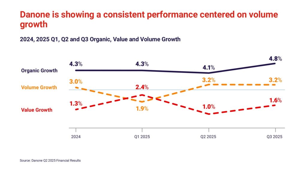Danone remains the strongest performer, and the only company showing volume growth ahead of value growth. Its disciplined strategy centered on health-focused platforms, specialized nutrition, protein, plant-based, and essential dairy, continues to deliver positive results, with volume growth stabilizing above +3%.