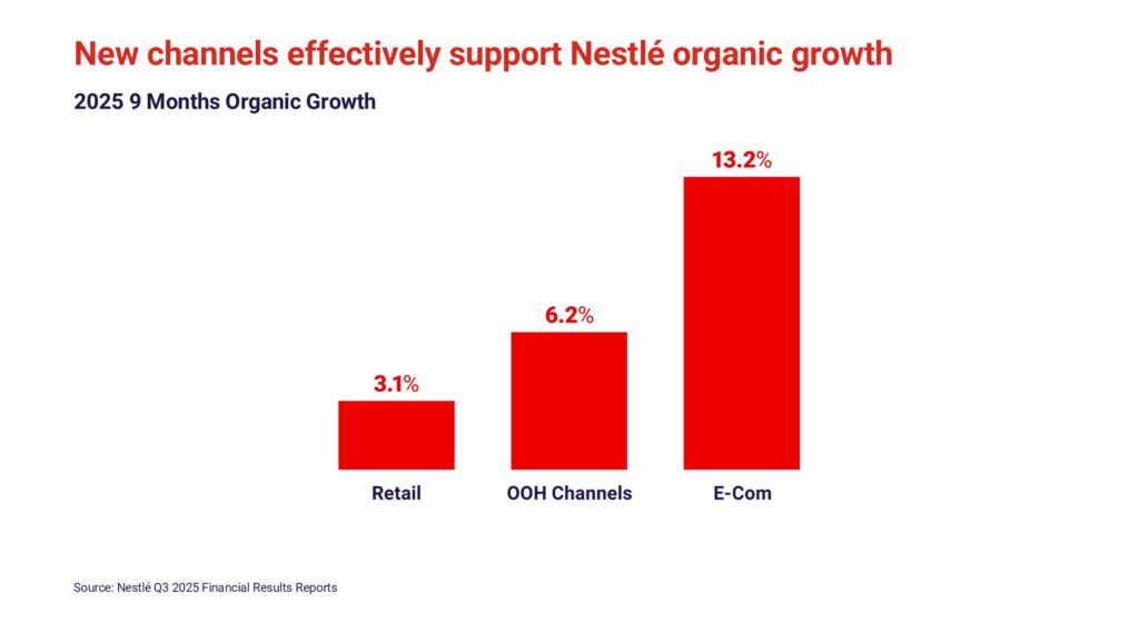 - Channel: Recognizing where growth is possible at a channel level is fundamental. Adapting the offer to the channel is essential. L’Oréal benefits from its leadership in online, where it continues to outperform in what is now the most dynamic sales channel. Nestlé approach to AFH and e-com is showing how a proper channel focus can provide great return. The level of growth in e-com is more than 4x the overall retail growth.