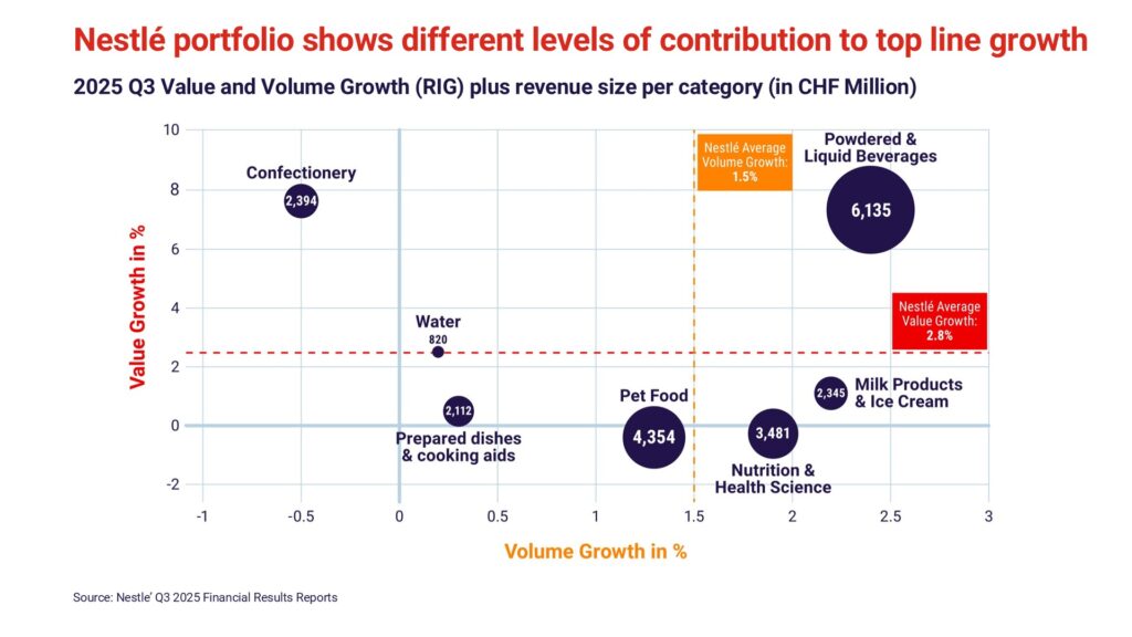 Nestlé delivered a noticeable +1.5% volume growth (Real Internal Growth – RIG) in Q3, a significant turnaround after two negative quarters and a weak 2024 (+0.8%). This reflects the impact of the previous and the newly appointed leadership on a volume-led strategy.
