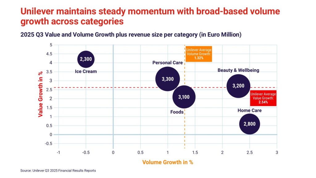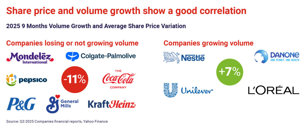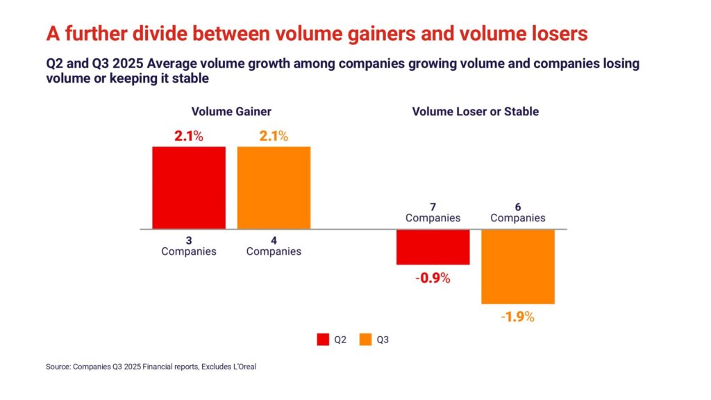 The same three companies that led in Q2 in volume growth, Danone, Unilever, and L’Oréal, continue to perform strongly in Q3, while Nestlé joins the cluster, marking a notable change after the weaker first two quarters.