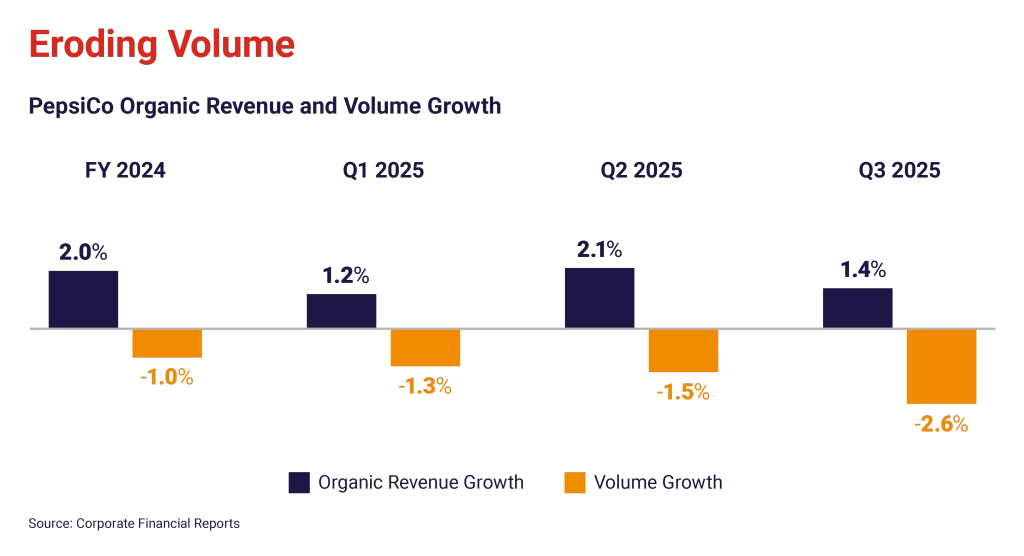 The five key contributors behind PepsiCo’s modest Q3 2025 volume performance are: