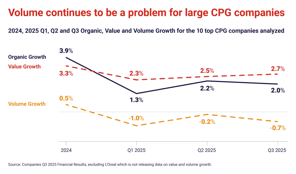 Organic growth remains stable, but volume pressure intensifies across the CPG sector.