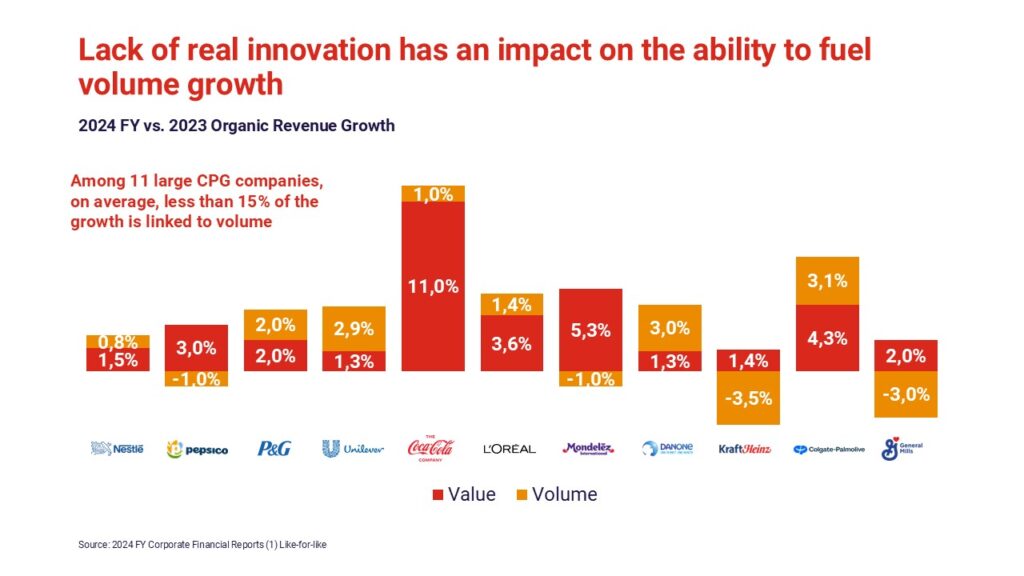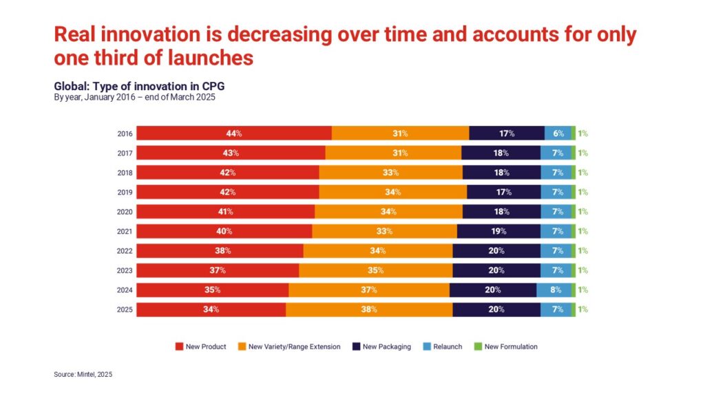 As a driver of sustainable competitive growth over time, innovation continues to be perceived as too risky, even moreso given the pressure for short term results. In fact, within the CPG industry it now accounts for only one third of new launches.