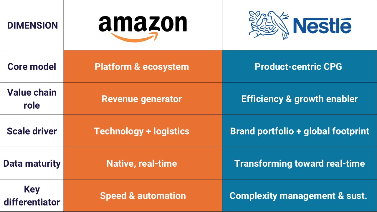 Amazon and Nestlé represent two distinct, but converging, approaches: