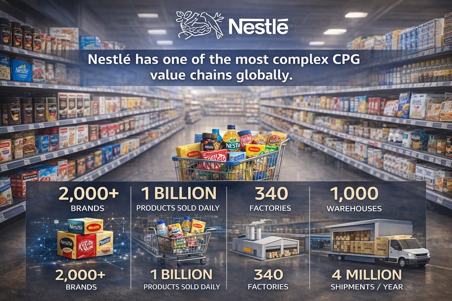 Nestlé operates one of the most complex value chains in the CPG industry, with thousands of brands, factories, and distribution nodes globally.